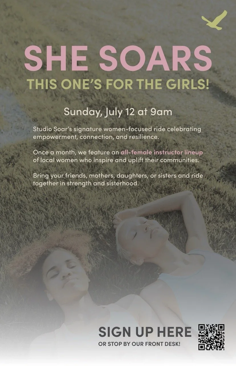 “She Soars” is Studio Soar’s signature women-focused ride, celebrating empowerment, connection, and resilience. Each month, the studio features an all-female instructor lineup, highlighting local women who inspire, lead, and elevate their communities.