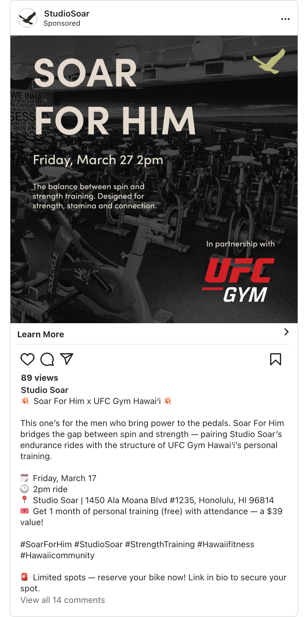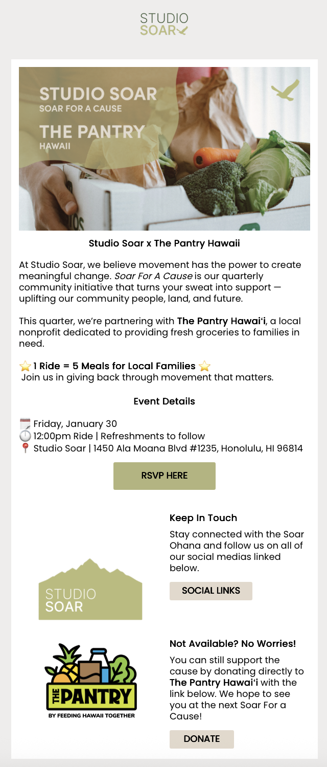Hosting quarterly events keeps the energy high and gives riders something to look forward to without overwhelming them too much. The campaign positions Studio Soar as a studio that gives back to Hawaiʻi, and invites new members who value community-driven wellness.
